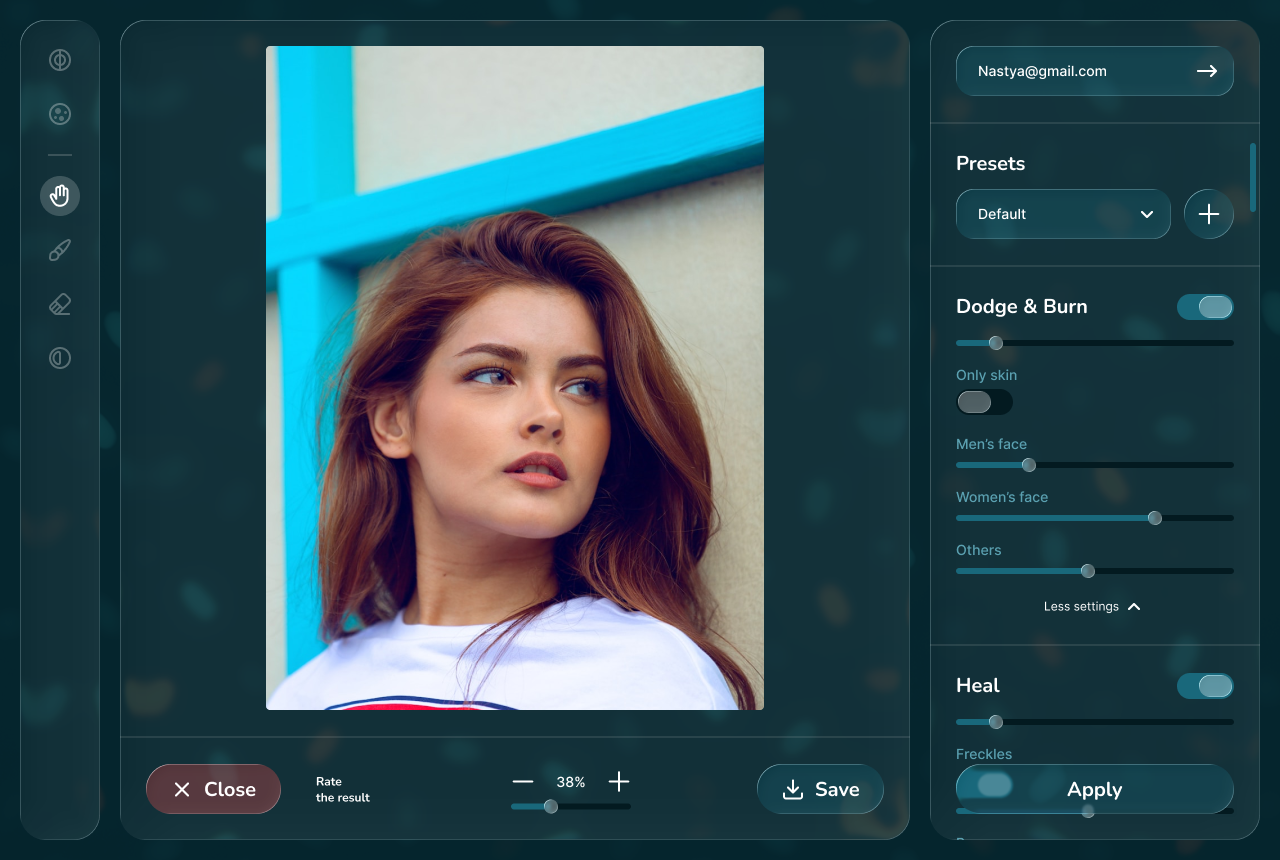 Automatically detects a person’s gender in the photo and applies the correct retouching approach.